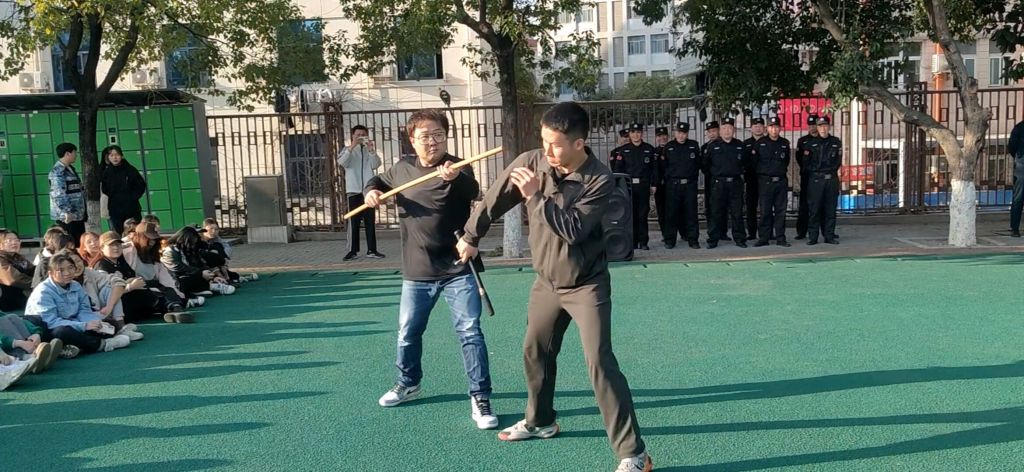 演练开始后,首先由校保卫处治保队演示了警棍、警棍盾牌的基本使用方法。随后,校保卫处马越老师针对可能出现的各种突发情况、防爆器材使用以及突发情况处置方法等方面进行了现场演示讲解。