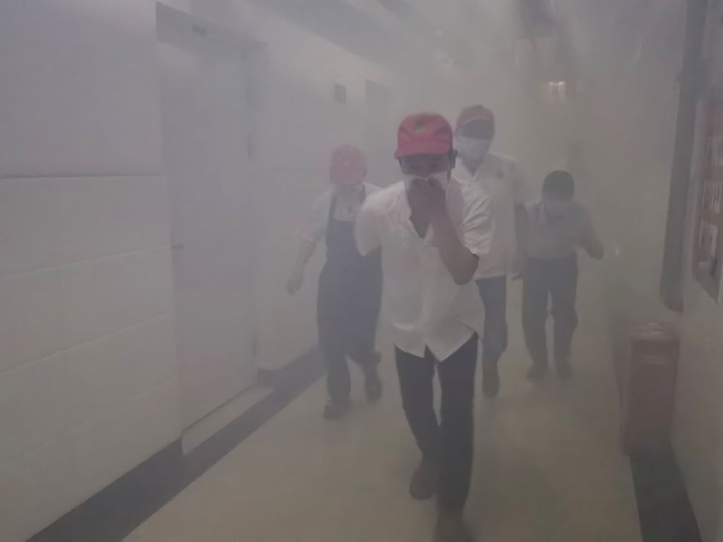 保卫处马越老师先为参加活动的人员带来了一场生动的消防安全知识讲座。深入浅出的介绍了火灾的危害性、如何预防火灾、如何正确使用消防器材以及火灾发生后如何安全逃生等方面的知识。之后,随着演练指令的下达,模拟火场的烟雾开始弥漫,当听到消防广播和警报响起时,学校立即启动应急疏散预案,在消防疏散引导员的引导下,大家按照预定的疏散路线,有序地撤离了“火场”,到达指定的安全区域。