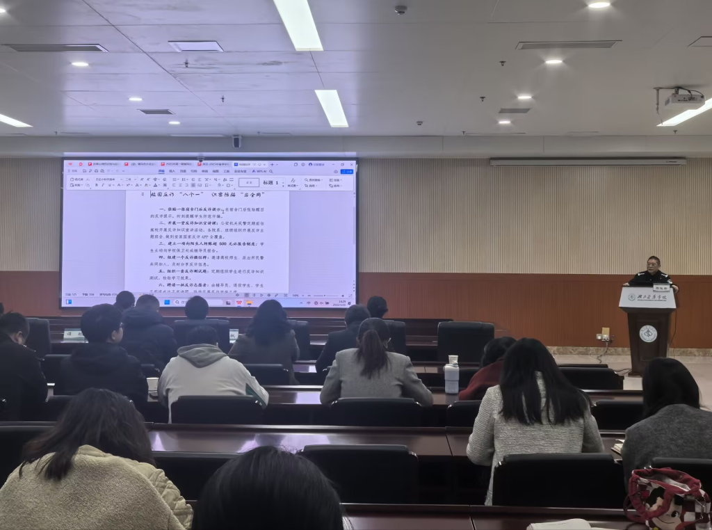 本网讯(通讯员 甘锐)为深化校园安全建设,延伸反诈骗宣传覆盖面,进一步提升我校辅导员防诈骗宣传教育能力,3月20日下午,保卫处联合学工处,邀请人民路派出所驻校民警邵定传警官、反诈民警邢杨昕警官入校,开展了一场实用、专业的反诈安全知识教育培训。各学院分管学生工作负责人、全体专兼职辅导员、班主任100余人参加了本次活动。
