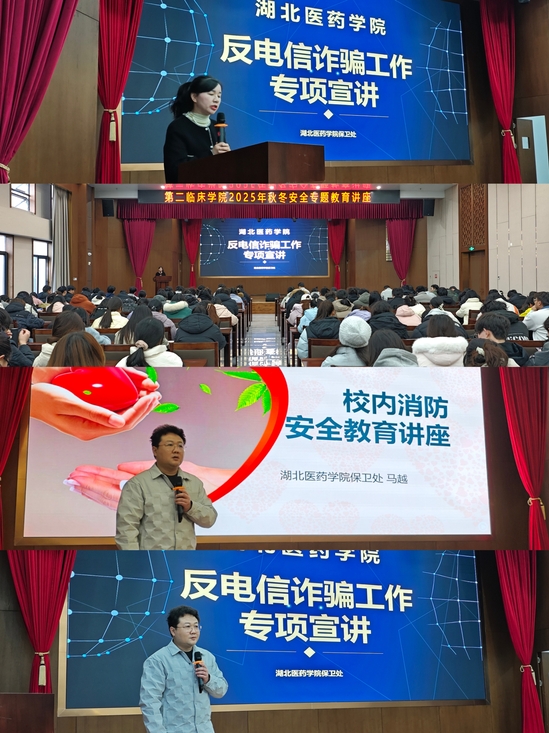 本网讯(通讯员 潘威霖)为切实提升师生安全防范意识,筑牢校园安全防线,11月28日下午,湖北医药学院第二临床学院邀请保卫处马越老师在附属国药东风总医院科教大楼报告厅举办反电信诈骗专项及校内消防安全主题宣讲活动。第二临床学院党委副书记陈立、辅导员代表及200余名学生参与活动。
