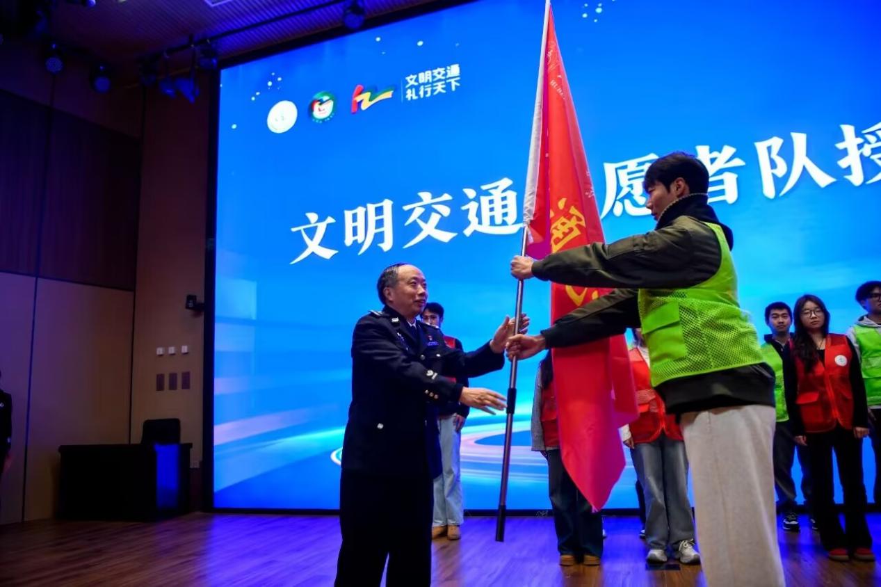 仪式环节将现场氛围推向高潮。十堰市公安局党委委员、副局长李新兵向湖北医药学院文明交通志愿服务队授旗,标志着校园交通安全志愿服务步入常态化、组织化新阶段。