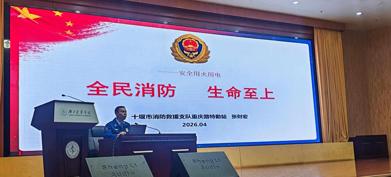 本网讯(通讯员 陈理炜)为进一步强化全体学生的消防安全意识,夯实校园安全防控基础,筑牢校园消防安全防线,4月14日下午,学校保卫处、学工处联合邀请十堰市消防救援支队重庆路特勤站站长张财宏同志,在科教楼学术报告厅开展校园消防安全专题讲座。全校500余名学生到场聆听学习,接受消防安全警示教育。